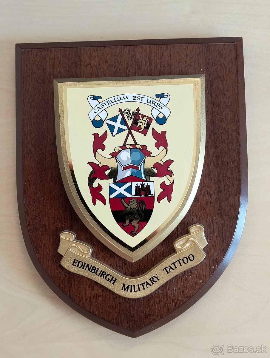 Predám drevenú plaketu Edinburg military tattoo. Rozmery: 18,5 cm x 14,5 cm x hrúbka 2,5 cm.