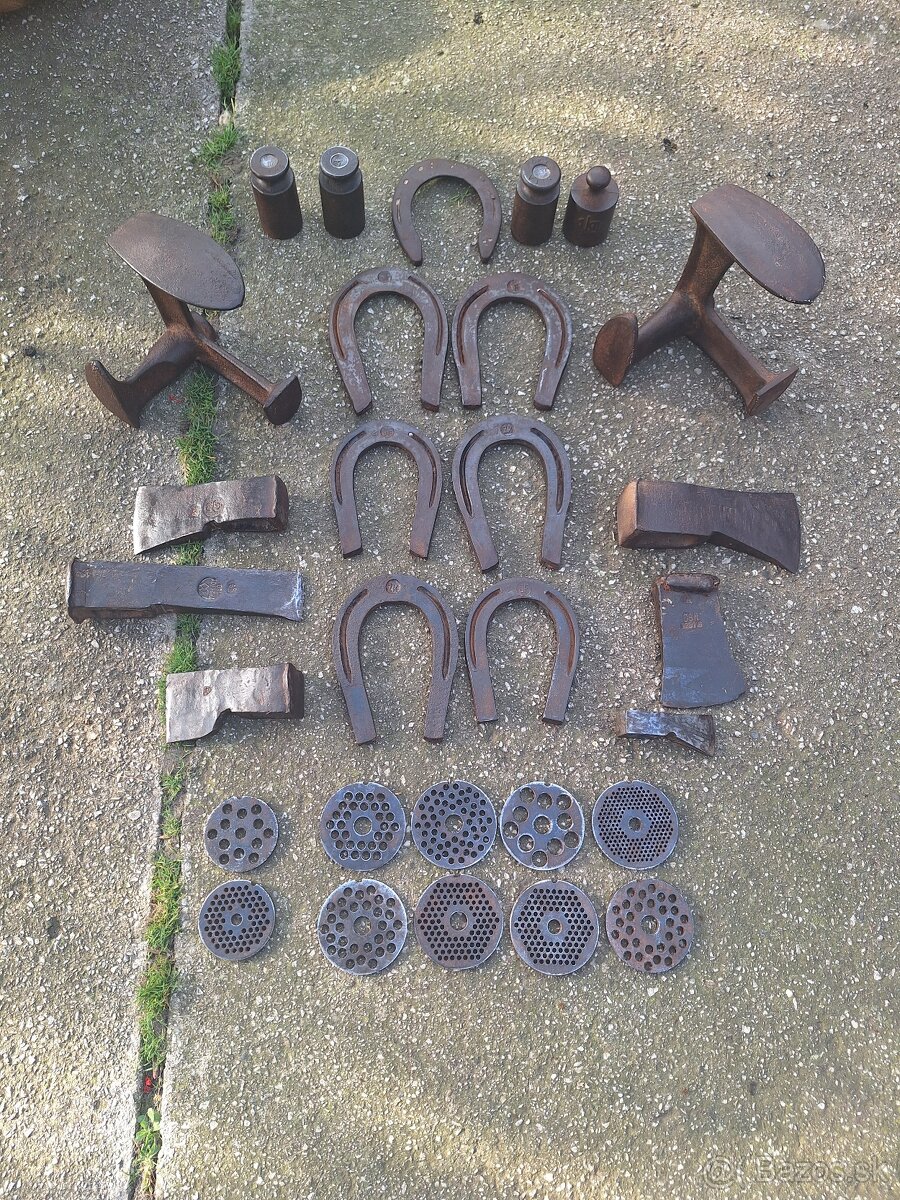 Obuvnicke kopyto 10e kus,podkovy predane,sekery predane ,šajby do mlynčeky 2e kus,závažia značené 5e kus, jedno 1kg 3e.