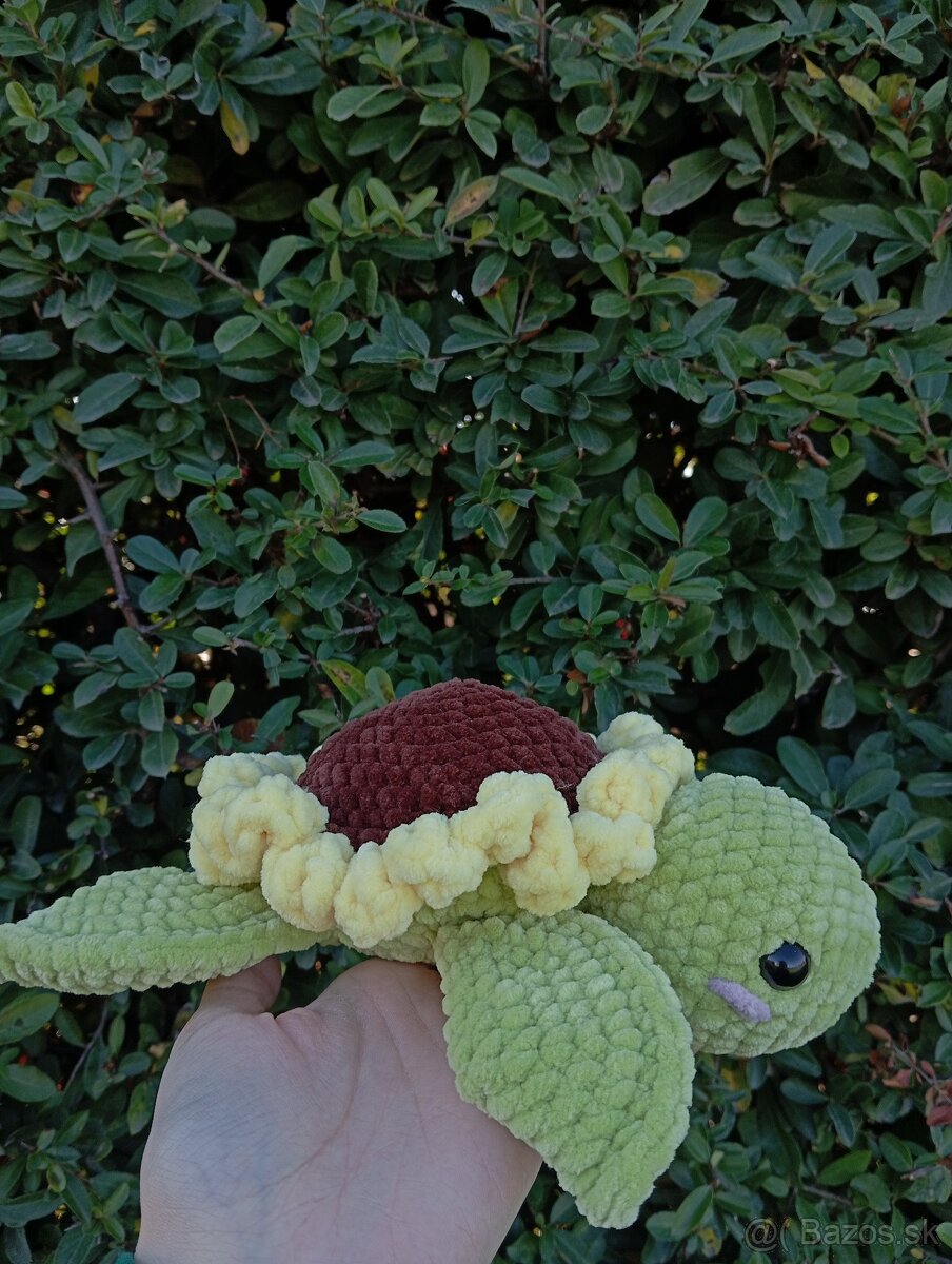 Predám ručne háčkovanú korytnačku vyrobenú z ženylkovej priadze Himalaya Dolphin baby, ktorá je mäkká a príjemná na dotyk, ideálna aj pre menšie deti. Výška cca 7cm, dĺžka cca 19 cm.