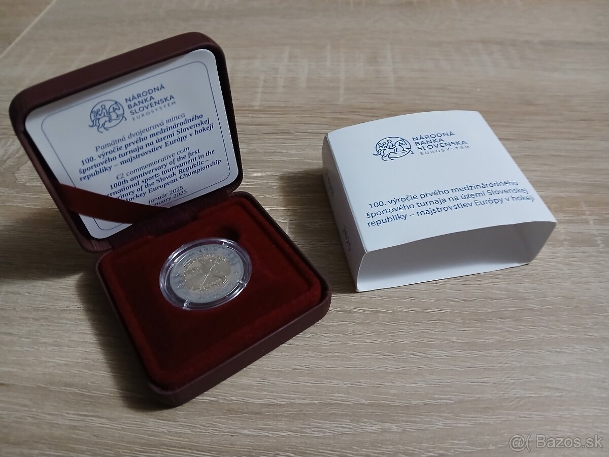 Predám 2 euro mincu Slovensko 2025. Prvý medzinárodný športový turnaj na území SR – Majstrovstvá Európy v hokeji – 100. výročie proof prevedení. Cena: 65eur/ks (pri odbere 2ks cena 60eur/ks) + poštovné.
