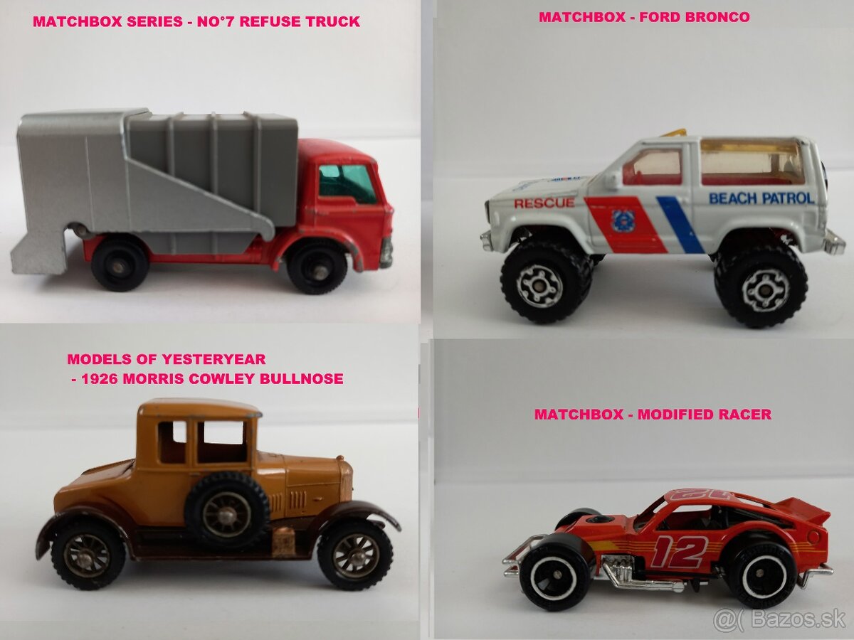 PREDÁM:MATCHBOX-NO°7 REFUSE TRUCK,MODELS OF YESTERYEAR-1926 MORRIS COWLEY BULLNOSE -9,99€/kus,FORD BRONCO,MODIFIED RACER-7,99€/kus