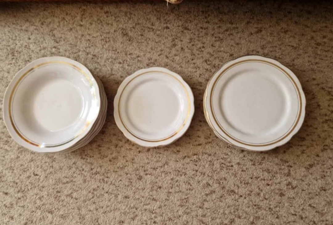 Obedova sada so zlatym okrajom. Hlboke 6kusov. Plytke 5kusov. Dezertne 4 kusy (1 ma poskodenie). Iba osobny odber RK.