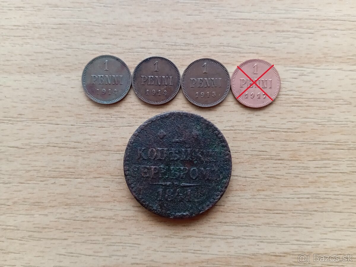 Predám mince 1 Penni 1914,15 za 3 Eura/kus, 2 Kopejka 1841 za 6 Eur