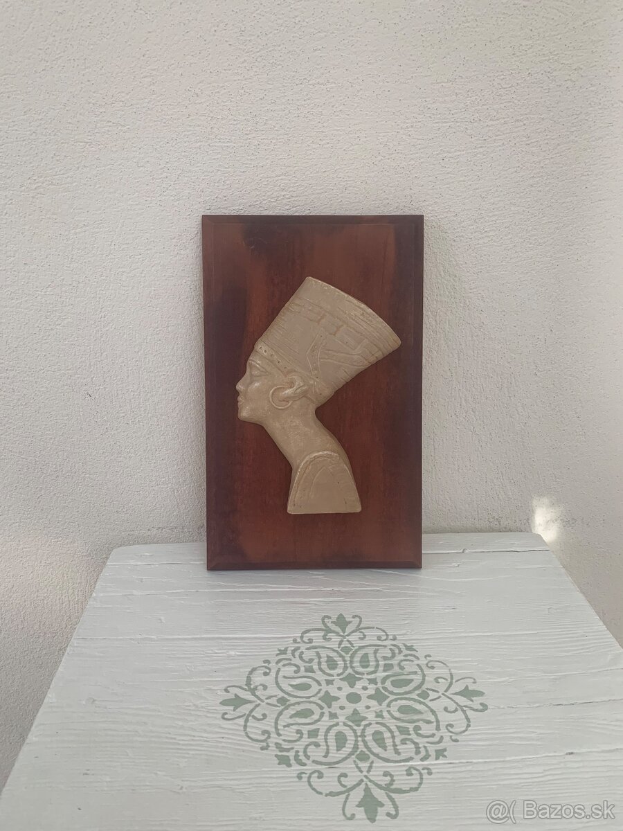 Sadrová hlava Nefertity na drevenom podklade na zavesenie. Ťuknutá, spredu to nevidno.