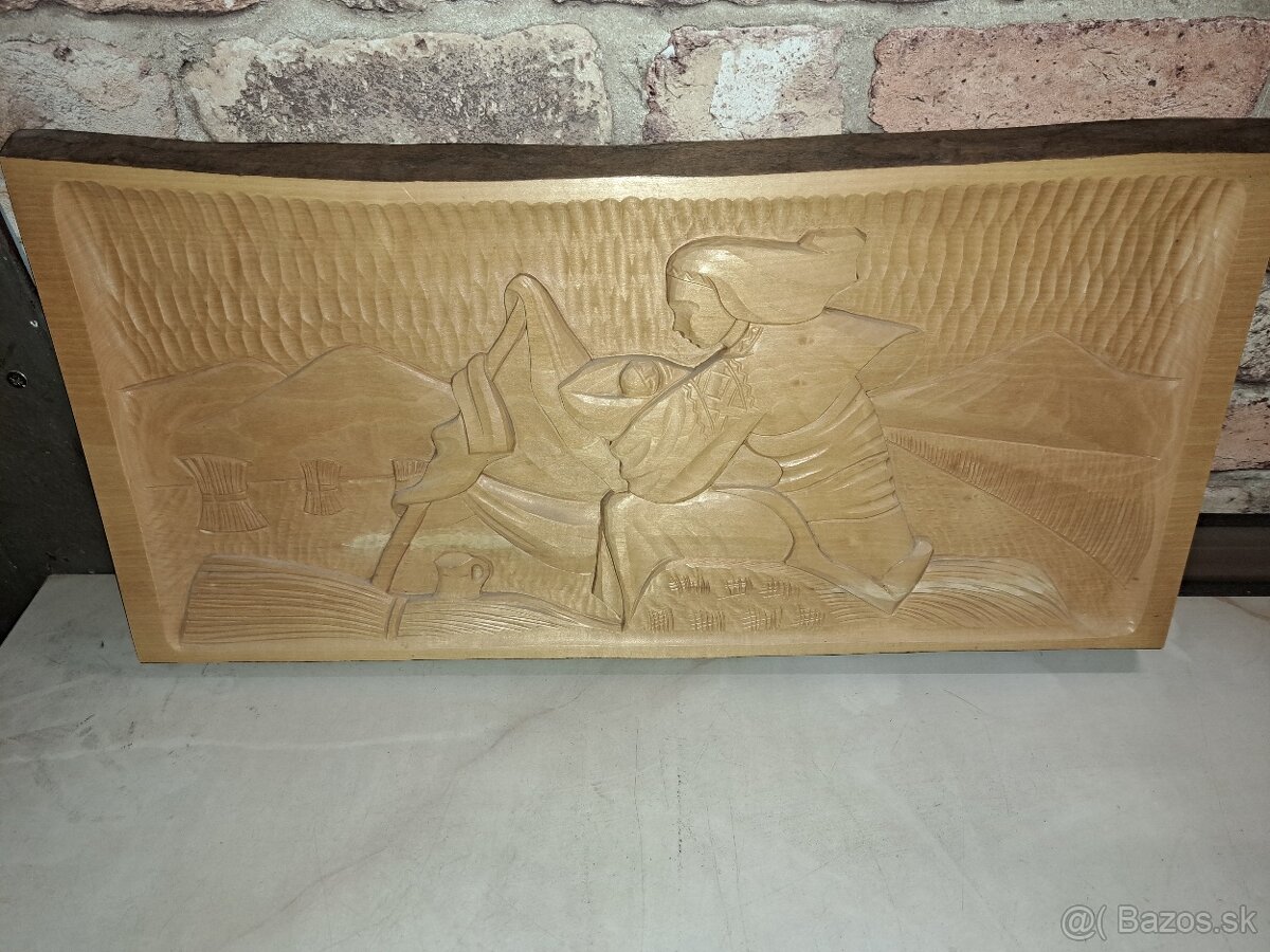 Prwdam dreveny, dlabany obraz s ĺudovym motívom. Rozmer 52 x 25 cm. Cena 50e plus poštovne.