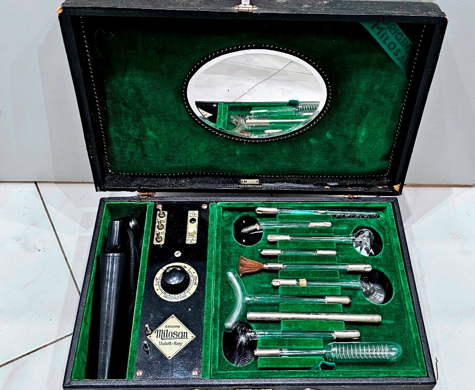 kufríkový domáci liečebný prístroj Milosan z 30tych rokov , funkčnosť neskúšaná ( zahraničná koncovka) kompletný , vhodné ako rekvizita , cena 130€