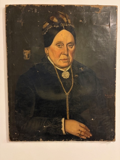 Potrét ženy , Géza T. Biró, olej na plátne, 800 × 700 mm - [5.11. 2025]Portrét dámy (1963) pôsobí dôstojne a sústredene: sedacia póza s prekríženými rukami, tmavý odev a jemne modelovaná tvár vytvárajú tichú autoritu, ktorú zvýrazňuje kamejový broš na golieri. Zelené, miestami lazúrne vrstvené pozadie s náznakom stoličky a zlatistým vertikálnym lemom vľavo dodáva scéne ...