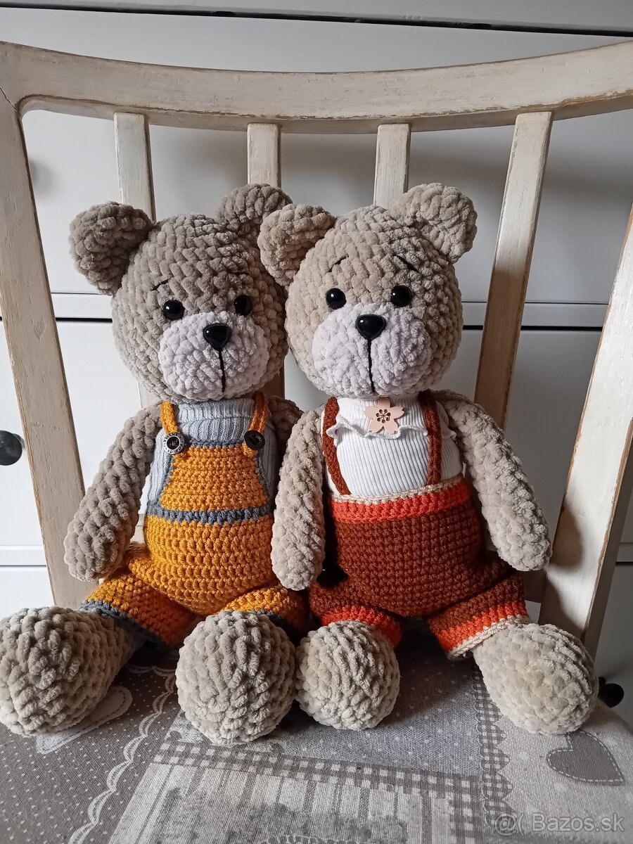 Vyplnený dutým vláknom.Macko v žltých nohaviciach(PREDANÝ).Macko v hnedých nohaviciach,výška 34cm,cena 15€.