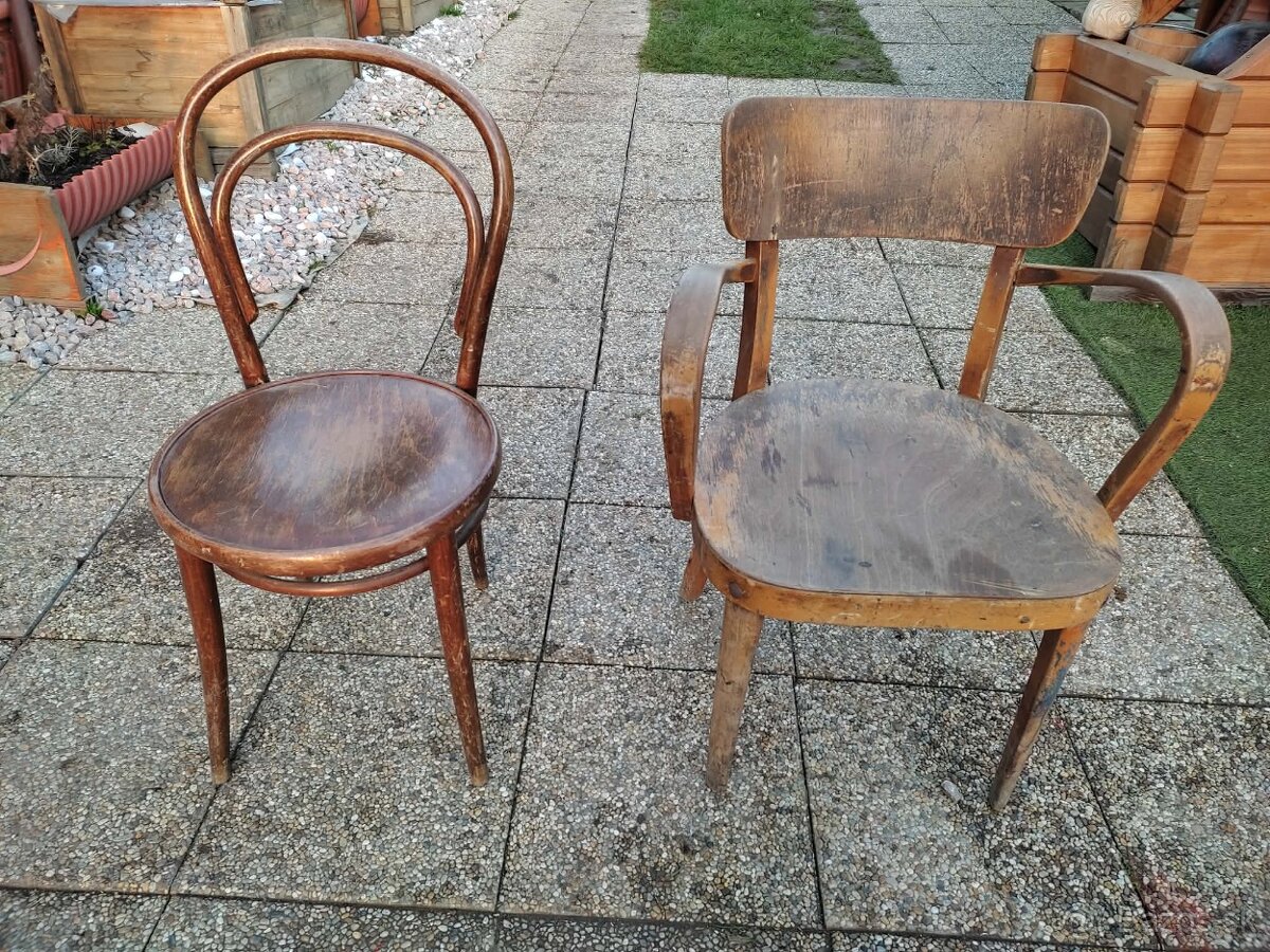 Vľavo THONET stolička za 50 eur a vpravo polokteslo za 40 eur. Stoličky sú pevné a zachovalé.