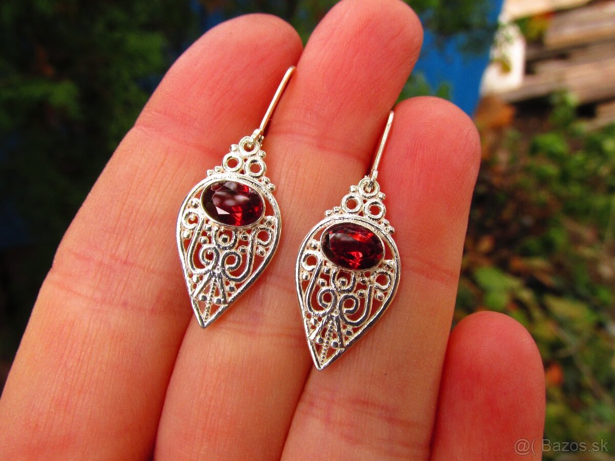 Ponúkam krásne dámske strieborné náušnice osádzané prírodným kameňom Granát, značené Ag 925. Sú v peknom zachovalom stave, viď. fotografie. Výška náušnice je 3,9 cm. Váha je 3,8 gramov. Lokalita Bratislava. Cena je 38 euro.