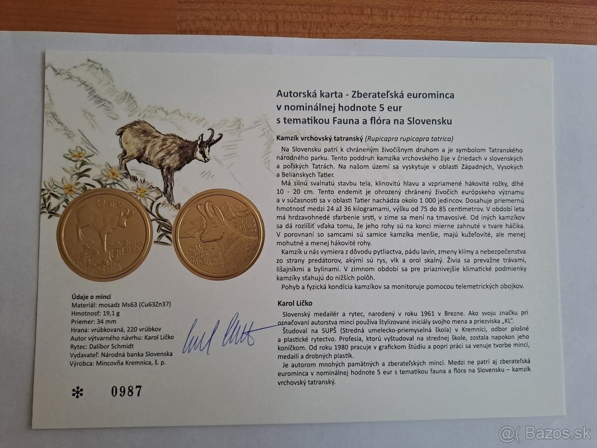 Na predaj autorsku kartu k 5 eurovej minci Kamzik Tatransky Karta je v 100% stave.