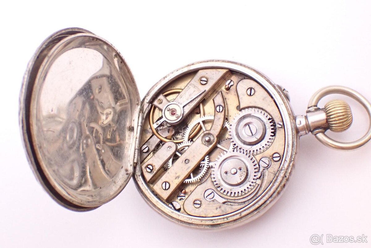 Starožitné dvoupláštové stříbrné zdobené kapesní hodinky.