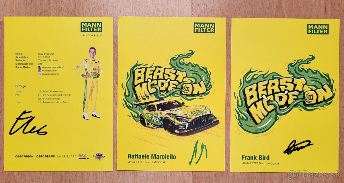 Prodám 3 autogramkarty Mercedes AMG GT týmu Mann Filter. 15x21 cm.