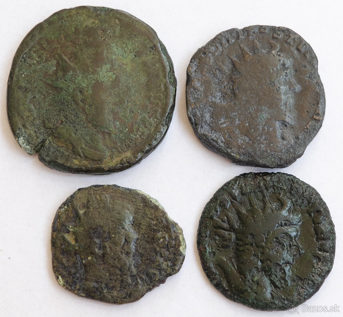 Ponúkam konvolut rímskych mincí panovníka Postuma, 2x dvojsestercius a 2x dupondius. Panovník má na hlave tŕňovú korunu čo značí že ide o dvojnásobok nominálnu, t.j. dvojitý sestercius alebo dupondius. Práve Postumus razil ako posledný panovnik tieto nominály v histórii rímskej ríše.