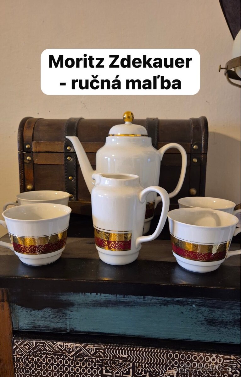 Kvalitný český porcelán Moritz Zdekauer, ručne maľovaný zlatom a červenými ornamentmi.