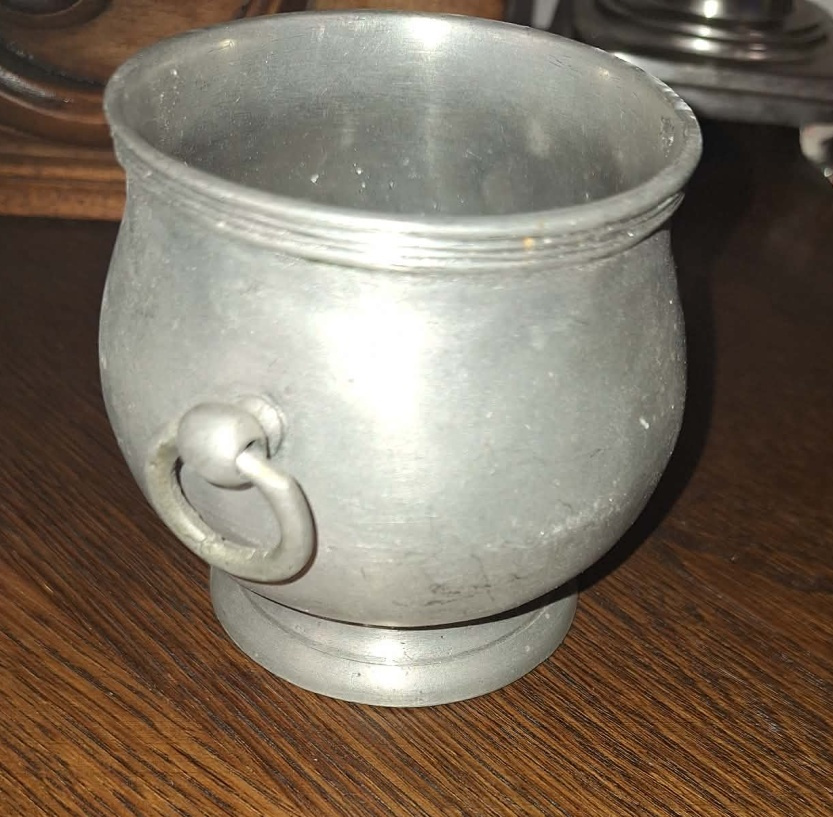 stará kovová, značená nádobka, myslí že cín, vo vrchnej časti má závit, teda isto chýba vrchnák, ale v pohode na dekoráciu, alebo aj ako mažiar aj takto poslúži