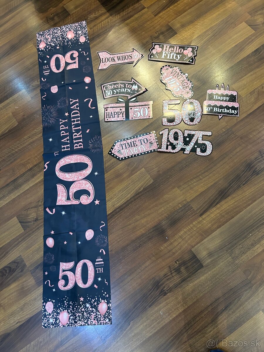 Predám 1x použité ozdoby na oslavu 50 pre ženu. Behun na stol a fotodekoracie (2 sú trošku poškodené vid foto)