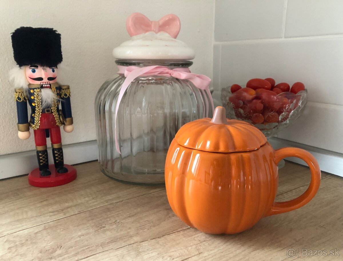 - párkrát použitý oranžový tekvicový hrnček/šálka s pokrievkou