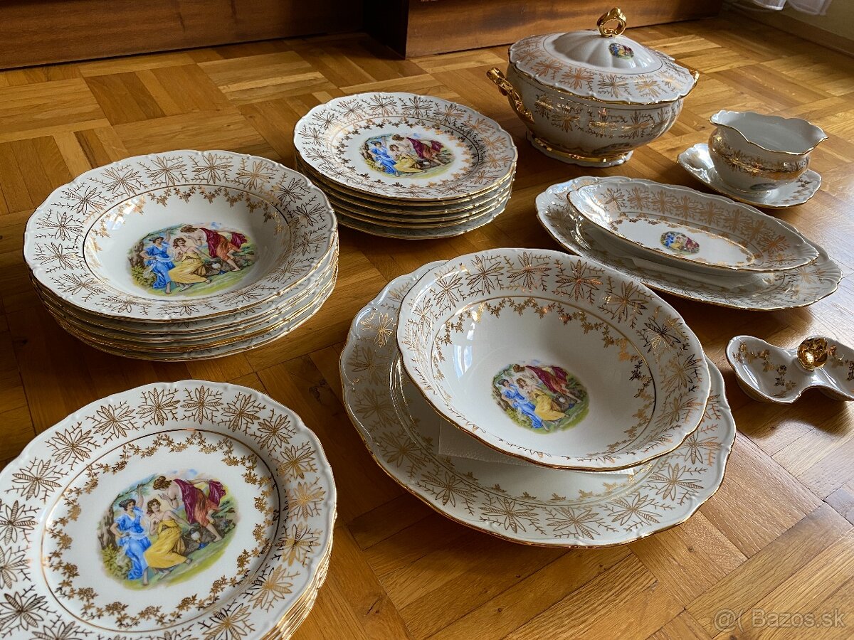 Prodám luxusní jídelní soupravu pro 6 osob značky Haas & Czjzek s motivem Tři Grácie. Souprava je kompletní a nikdy použitá. Souprava obsahuje: 6x talíř mělký, 6x talíř hluboký, 6x talíř dezertní, polévkovou mísu, velkou oválnou mísu, malou oválnou mísu, velkou mělkou mísu, velkou hlubokou mísu, omáčník s podomáčníkem a dvoudílnou slánku a pepřenku.