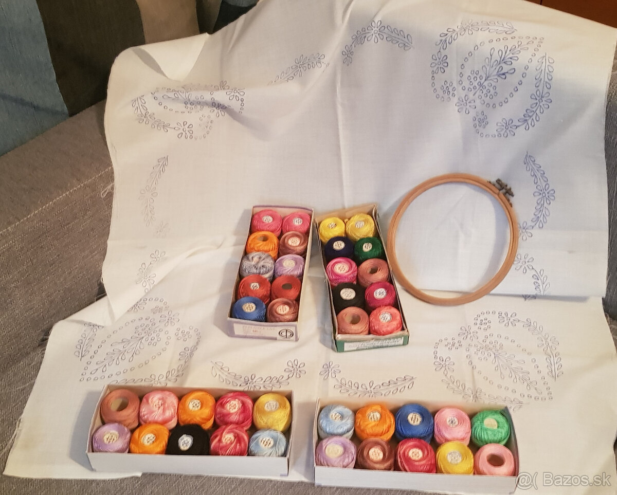 Predám perlovky, obrus na vyšívanie a drevený rám na vyšívanie.