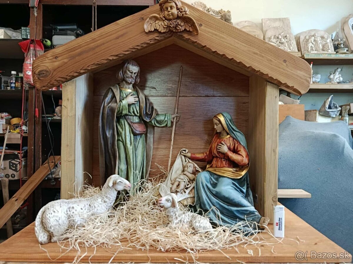 Predám nádherný Betlém. Márie s dietatom, Josef a ovečky v drevenom prístrešku. Výška postavy (Josef) cca 50cm. Domček š- 80 cm, v. 70 cm. Nádherné masívne figury z pevného prírodneho materiálu so živicou . Sochy sú verná replika z kostola svatého Michaela archanjela zo sudet v ČR.Sú ručně malované s polychromiou a patinou. Cena 460,-eur.Pište radšej správu. Na tel. nemám občas signál