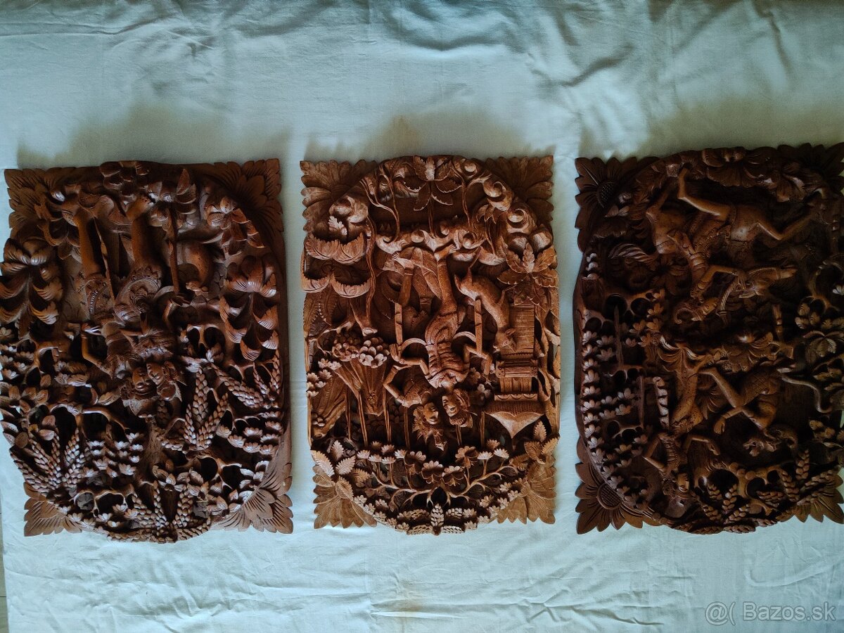 Tri veľké, ručne vyrezávané 3D obrazy s dokonalým zmyslom pre detail z Rámájany (Ráma, Sita a Hanuman). Vyrobené na Bali. Dve z 1980 a jedna asi 1990. Rozmer cca v.50 x š.34a37 x h. 6 cm!!! Precízne vyrezávané koruny stromov, šiat a.i. Výborný stav.