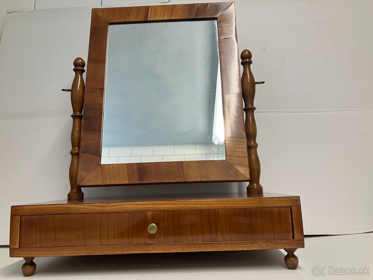 Toaletné starožitné zrkadlo, dá sa rozobrať, staré zrkadlo má rozmery : 57 X 46 cm,otáčajúca horná časť, dolná časť na 4 nôžkach so šuflíkom. V bytovom veľmi peknom stave-viď foto. Poštovné na dobierku v dôkladnom balení 6 Euro.