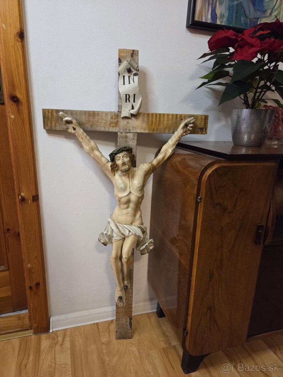 Drevený kríž - [29.11. 2025]Predám starožitný drevený kríž s ručne vyrezávaný Ježišom vrátane zadnej strany,ručne maĺovaný pôvodnými farbami,pekný stav, malé odlupnutie vzadu na hlave.Ĺudové sakrálne umenie, koniec 19. začiatok 20 storočia. Výška 62 cm, šírka 30 cm