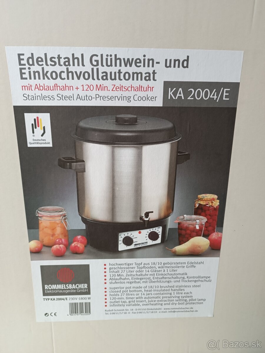 Predám zavárací hrniec Rommelsbacher (nemecká kvalita a značka). Zavárací hrniec Rommelsbacher KA 2004 / E: Nielen v letnej sezónu sa zavárací hrniec stane veľkým pomocníkom. Nerezový plne automatický hrniec zaisťuje jednoduchú konzerváciu potravín. Nielen v letnej sezónu sa zavárací hrniec stane veľkým pomocníkom. Nerezový plne automatický hrniec zaisťuje jednoduchú konzerváciu potravín. Tiež ho môžeme použiť ako automat na varené víno, pripraviť polievku, guláš alebo roztaviť vosk. Automatický časový spínač (20 - 120 min.) Zaručí spustenie až po dosiahnutí nastavenej teploty. Možno teda regulovať podľa potreby a typu pripravovanej suroviny. kľúčové vlastnosti Plne automatický zavárací hrniec Vypúšťací ventil aj kohút Vnútorný objem 27 litrov (14 pohárov po 1 l) Kábel 1,5 m Časový spínač 20 - 120 min. Ochrana proti prehriatiu Vnútorné rozmery - priemer 353 mm Príkon 1800 W Rozmery cca 48 × 39 × 46 cm Hmotnosť 6,6 kg. Hrniec je úplne nový, nepoužívaný, TOP stav, originál balenie. Viac info v maily.