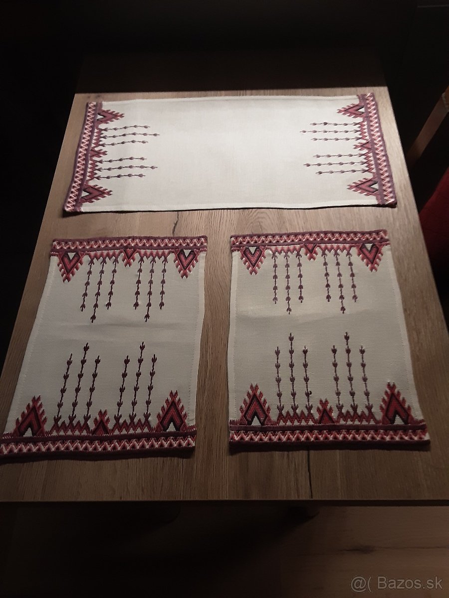 Ručne vyšívaný set prestieraní na bavlne v top stave 1kus 50x26cm a 2kusy 30x22cm spolu v cene 23€.Vyšívaná biela štóla s bielou vyšívkou a obháčkovaním rozmeru 89x33cm za 15€.Vianočné prestierania s rozmermi na fotke za 8€kus.Štvorcový obrus 83x82cm na béžovom plátenku za 15€.