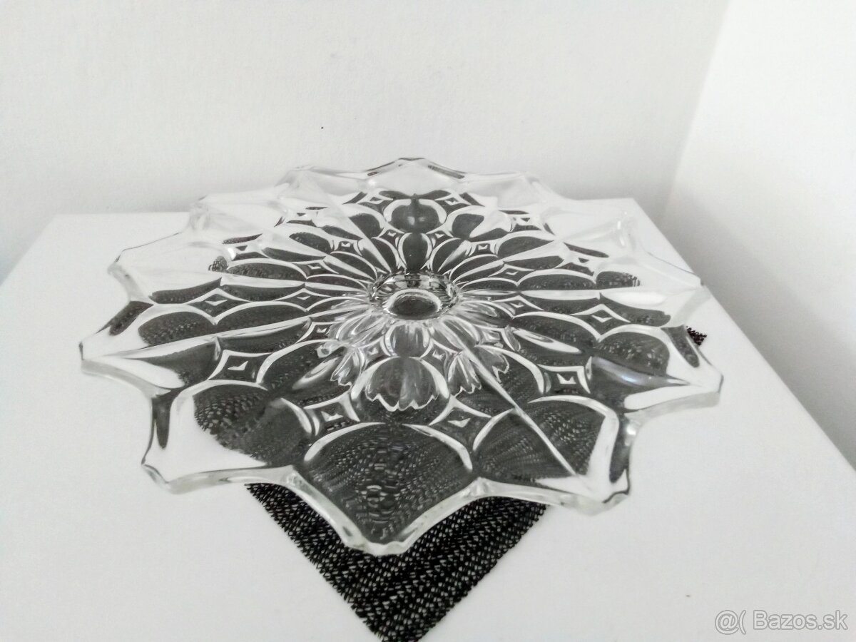 Nabízím starý, skleněný nástolec v dobrém stavu, bez oťuků . Krásné , masivní staré sklo. Průměr 36cm, výška 7cm.