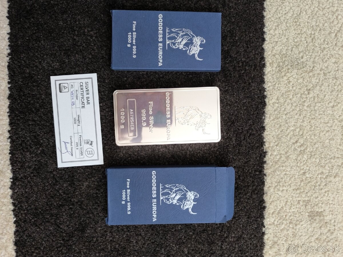 Predám investičné strieborné tehličky, 1000 g rýdzeho striebra aj s certifikátom. Na lícnej strane tehličky je „Goddess Europa“, rýdzosť „999,9“, kov „Fine Silver“, hmotnosť tehličky „1000 g“ a sériové číslo.