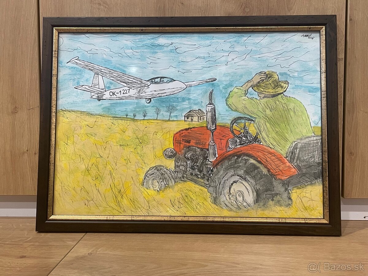 Predám ručne maľovaný obraz vetroňu ako pristáva na pole. Dielo je inšpirované skutočnou událosťou ktorá sa stala na východe Slovenska, keď vetroň úspešne pristál na pole hneď vedľa farmára na traktore. Na vytvorenie obrazu som použil Vodové farby, Tuš, Uhlík. Obraz je v ráme a má rozmer A3. Ku obrazu dávam aj certifikát pravosti. Kontakt mail alebo telefón.