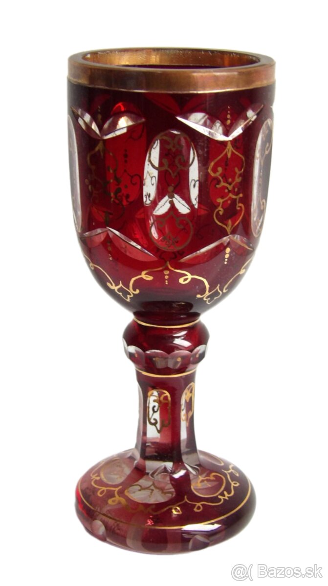 Masivní pohár z čirého skla vrstvený rubínovou lazurou a broušený, stojí na kruhové patce, na spodní straně patky vybroušená hvězdice, pohár celoplošně zdoben zlatě malovaným dekorem, výška 19,5 cm, kvalitní zabalení je samozřejmostí, dobírka Packeta 5,-€.