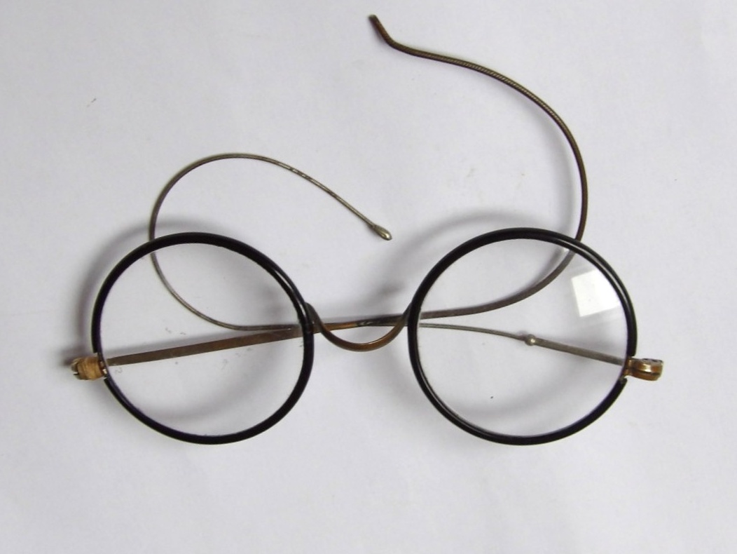 Staré kulaté brýle z období I. Československé republiky. Kovová konstrukce s černě lakovanými kruhovými obroučkami, tenké kovové nožičky typu zahnuté za uši (bez kloubů pružné). Brýle jsou osazeny čirými skly, kvalitní zabalejí je samozřejmostí, dobírka Packeta 5,-€.