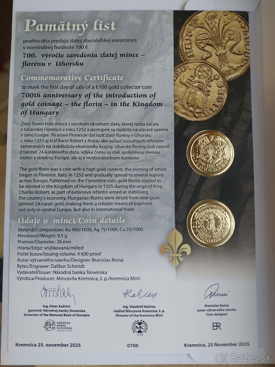 100€/2025 - Zavedenie zlatej mince - dukátu v Uhorsku - 700. výročie.