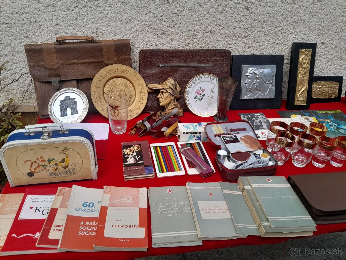 mix vecí z čias socializmu.Kožená aktovka,bakelitový telefón na kľuku Tesla,kovová plastika Baník-hutník,NHKG KUNČICE,propagačná literatúra,detský kufrík-korčule Bambíno,masážny strojek,bianko kronika ĽUT,putovný pohár Rovinka,tanier OH moskva 1980,propagačný tanier Vihorlat Snina,knihy Pämeť národa tri diely,pohár ČSĽA -letectvo,Ruské poháre z let.spoločnosti AEROFLOT.Stav dľa foto.NEDOSTUPNÝ DETSKÝ KUFRÍK.