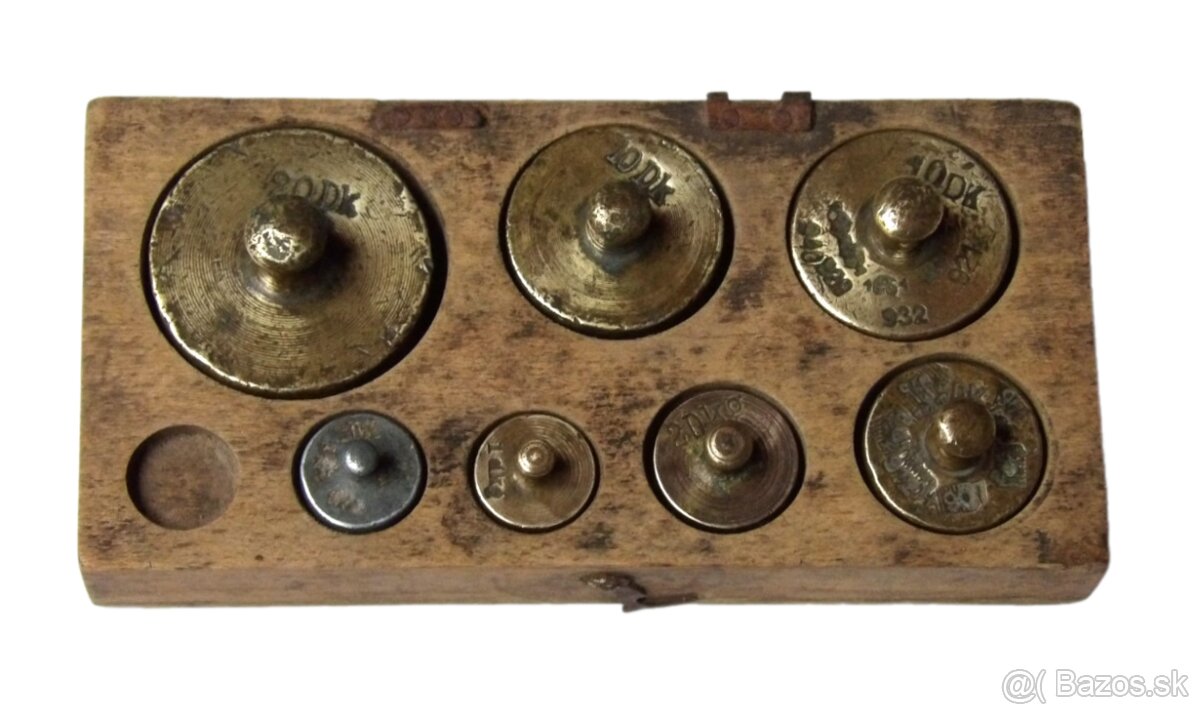 Stará sada dekových závaží 20, 10, 10, 5, 2, 1, 1 dkg, chybí horní díl krabičky a nejmenší závaží 0,5 dkg, dobírka Packeta od 5,-€.