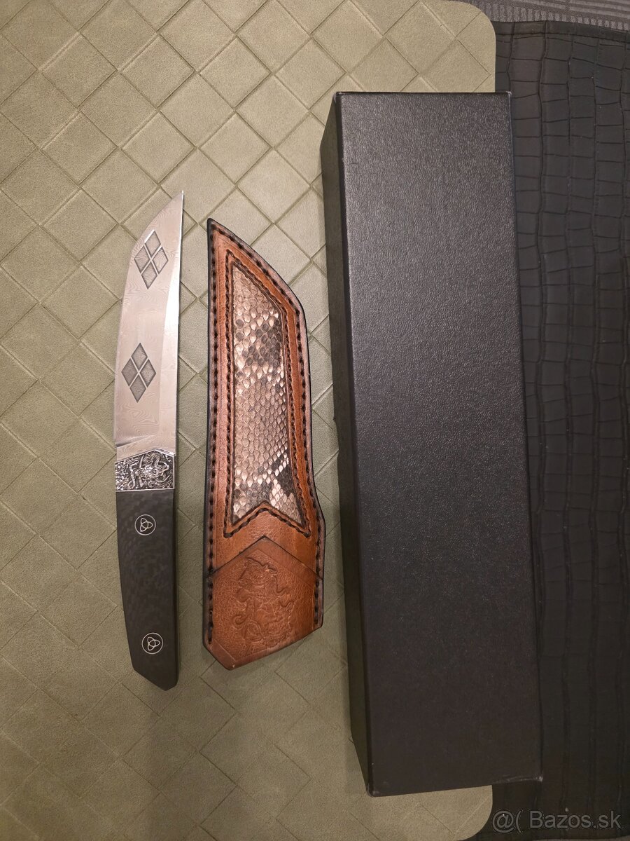 Damaškový nôž - [3.12. 2025]Krásny damaškový nôž v japonskom štýle, tant v darčekovej krabičke, rukoväť (10,5 cm) aj pošva (lakované, vyleštené) je naozaj parádne drevo, cez 22 cm celkovej dĺžky aj s pošvou, cca 11,5 cm dlhá damašková tanto čepeľ s naozaj peknú kresbou damašku, hrúbka čepele cez 3 mm, šírka cca 2 cm, nepoužíva ...