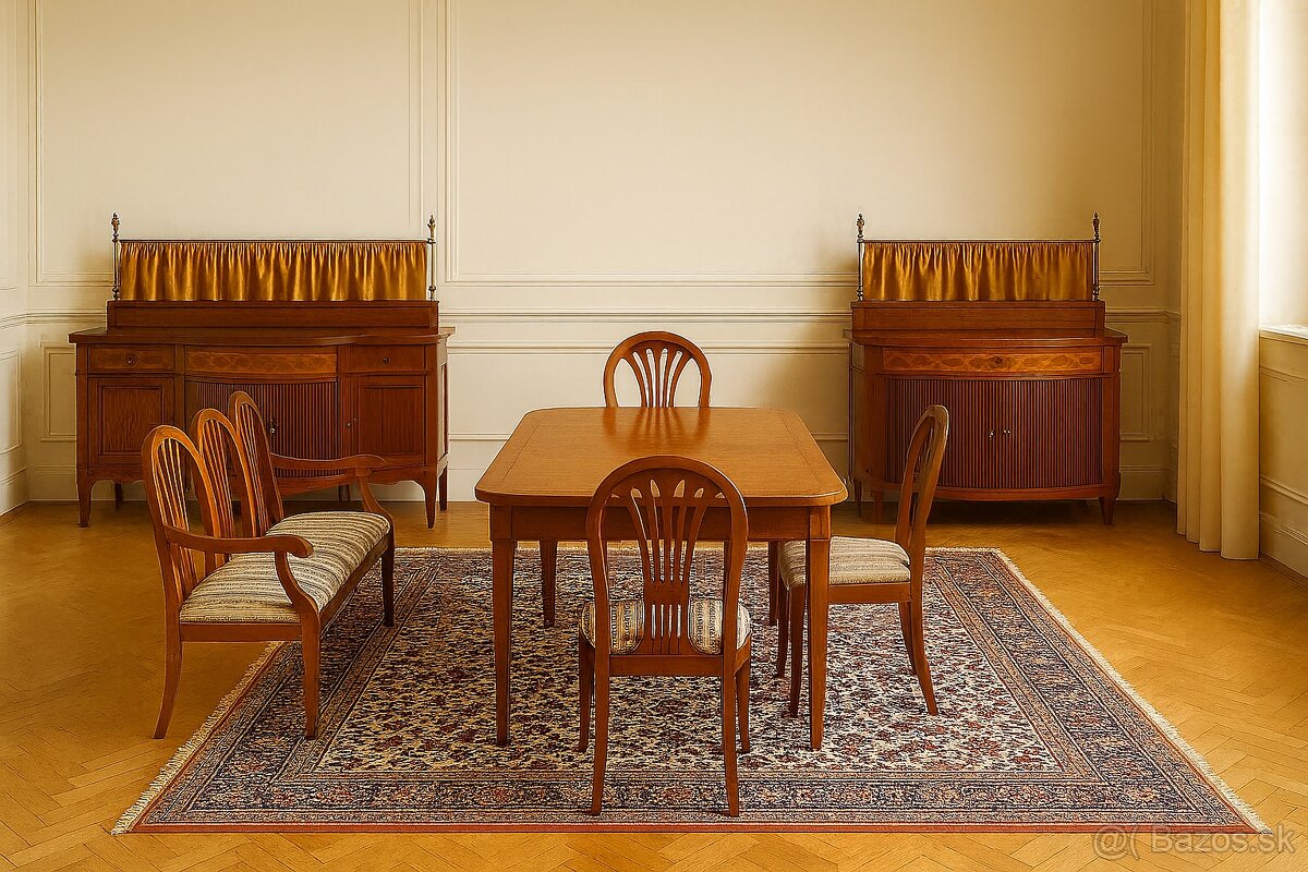 Tento vzácny, kompletne zachovaný set nesie jeho typický secesný (Jugendstil) rukopis – plynulé línie, ušľachtilé dreviny a majstrovské spracovanie. 💎