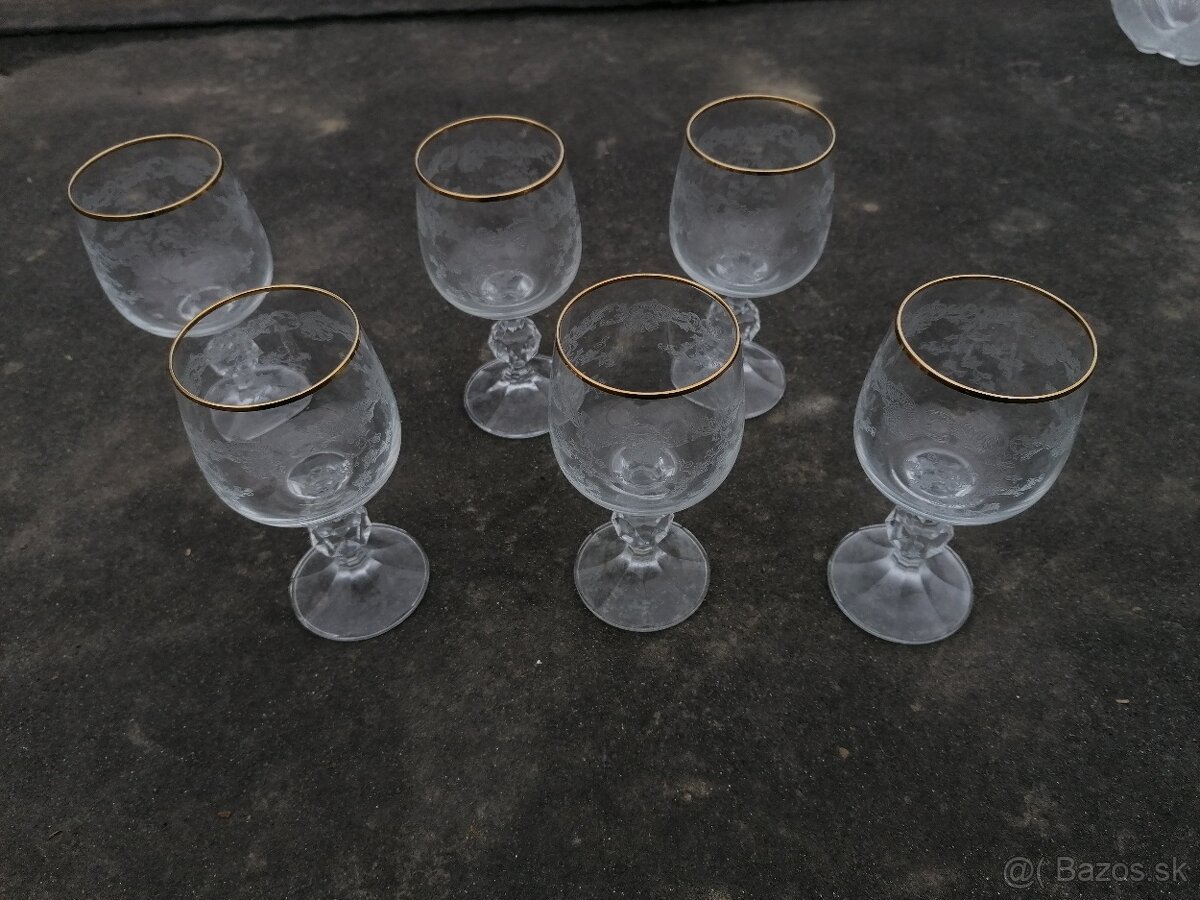Predám sklenené poháre na víno, celá súprava 6 kusov. Poháre majú po obvode jemný leptaný kvetinový vzor, vrchný okraj je zdobený zlatým lemom, v spodnej časti je krásna brúsená guľová časť. Výrobca Bohemia crystal. Výška pohárov 15cm. Cenu ponúknite