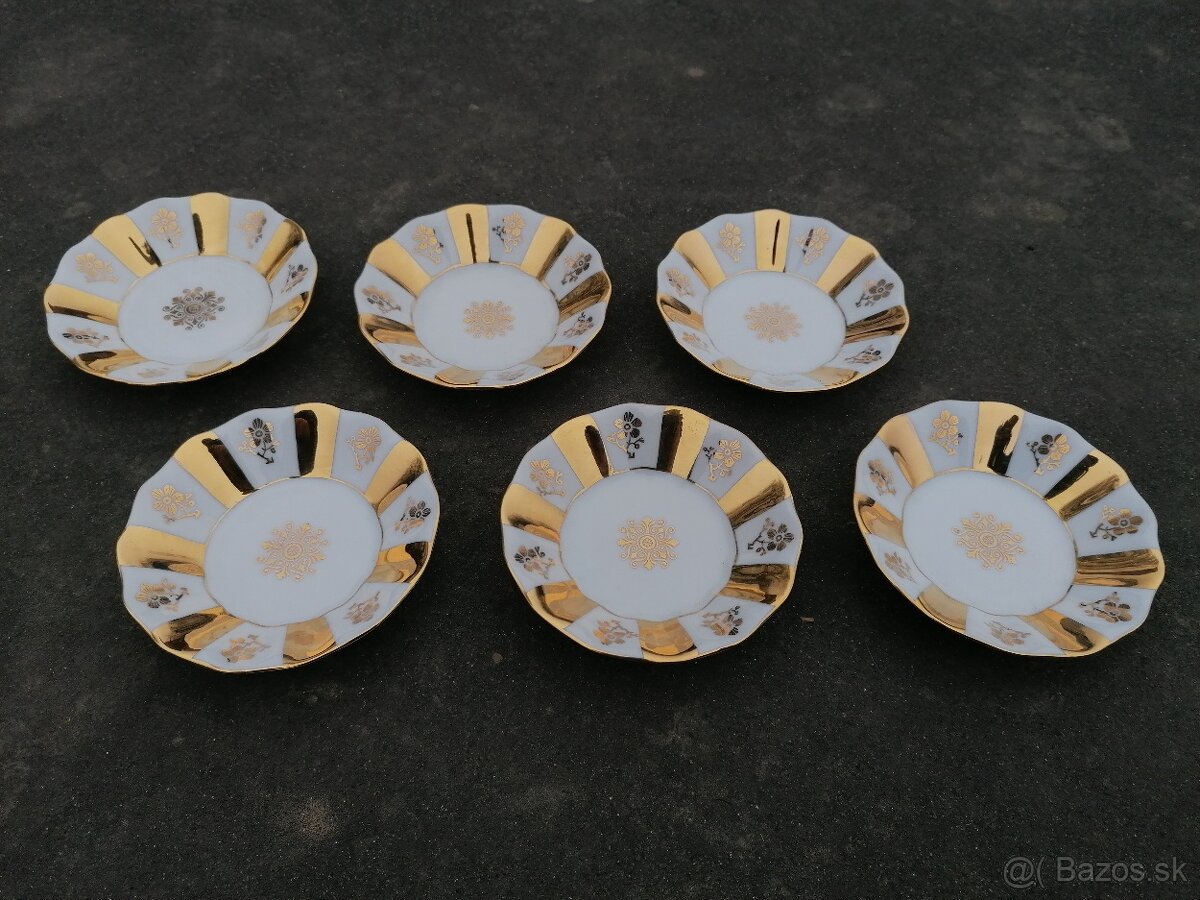Predám porcelánovú sadu zlatených misiek alebo hlbších tanierov- určené na kompót, zmrzlinu. Celá súprava 6 kusov. Misky majú bohaté zlaté zdobenie. Výrobca Porcelánka Concordia Lesov Karlovarský porcelán Československo. Priemer misiek je 12cm, výška 3cm. Cenu ponúknite