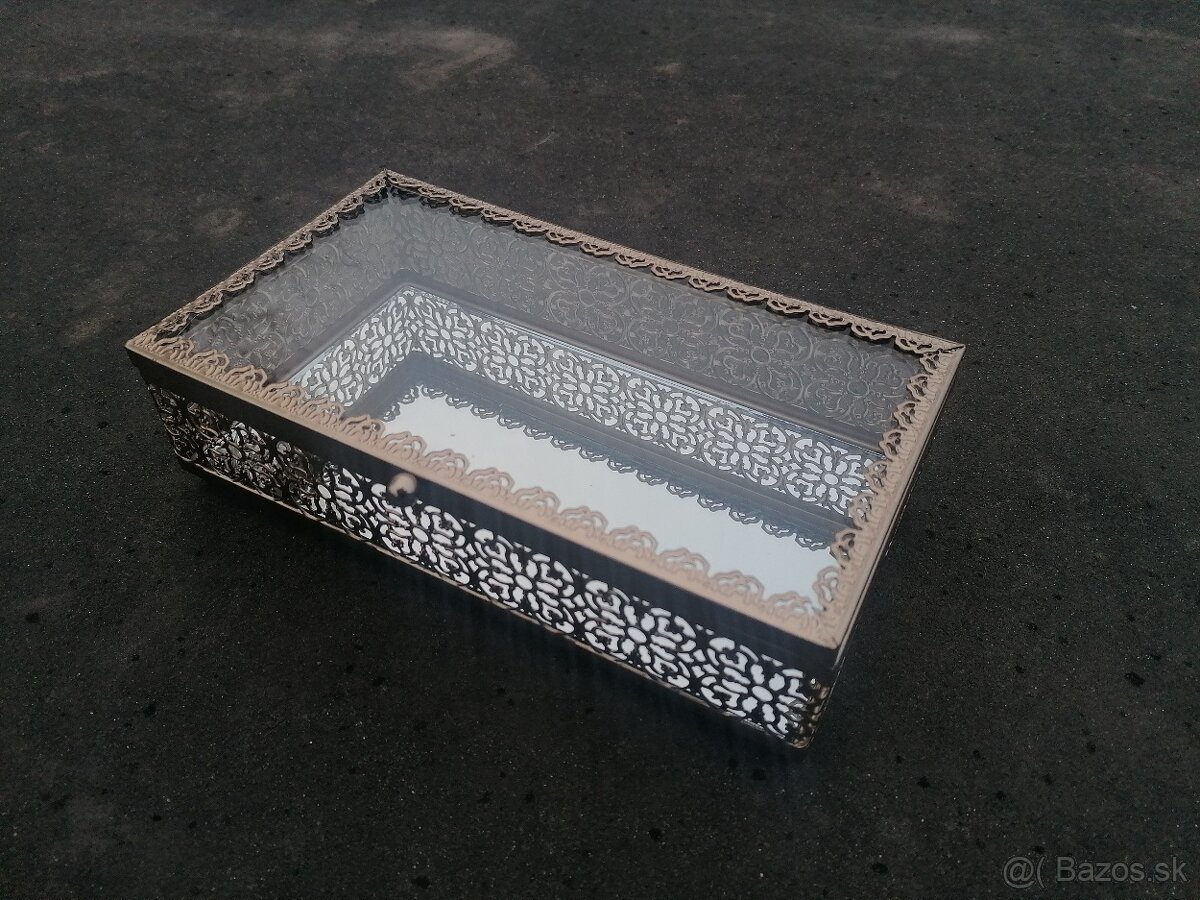 Predám túto zaujímavú kovovú šperkovnicu- vitrínu, materiál je teda železo- kov, z vrchnej časti je sklo, vnútri na spodnej časti je zrkadlo. Šperkovnica je v TOP stave, bez akéhokoľvek poškodenia. Rozmer 24,5cm x 14,5cm x výška 7cm. Cena 35€