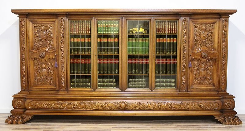 Starožitná neorenesanční knihovna na lvích tlapách s erby