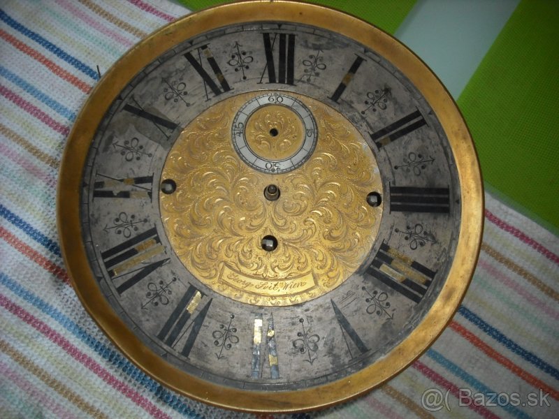 Predám starožitný hodinový trojzavažový stroj so sekundovým ukazovatelom vhodný do nástenných alebo podlahových hodín.Signovaný "Georg Svit Wien".Priemer ciferníka s obrubou 22,4cm.