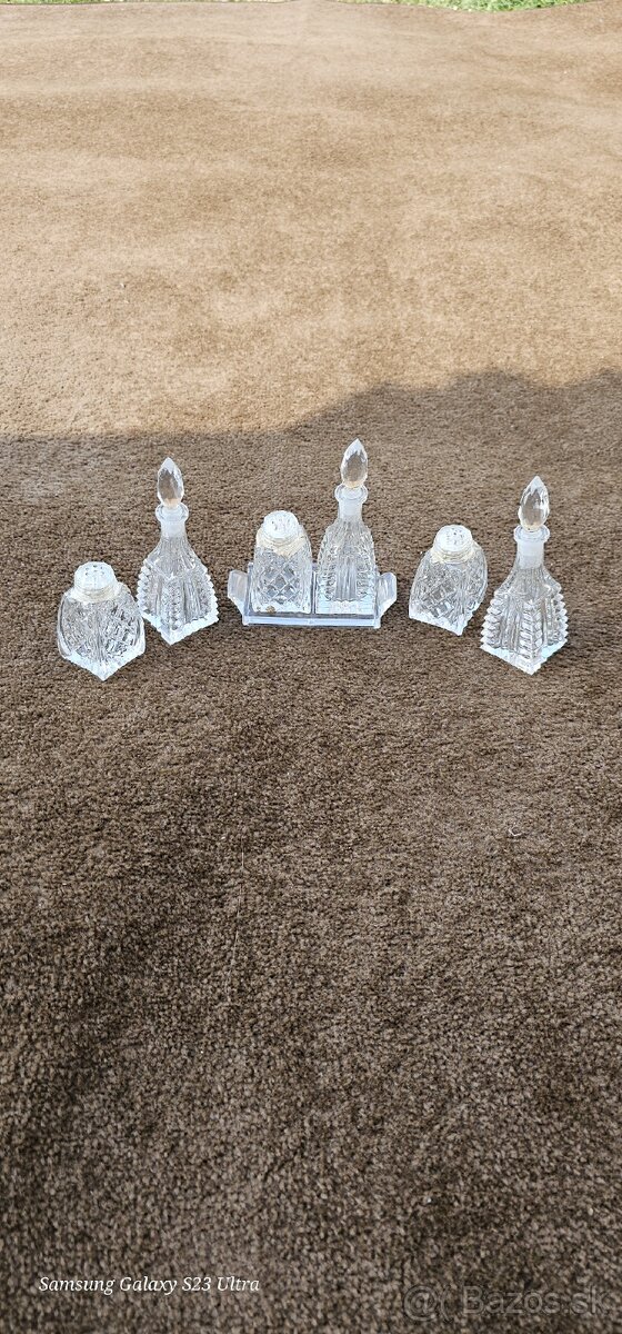 "Na predaj stary skleneny/ krištálový set S flakóny S uzávermi. Pekny dekoratívny kúsok, vhodný ako ozdoba alebo do zbierky. Neponičené, bez prasklín."