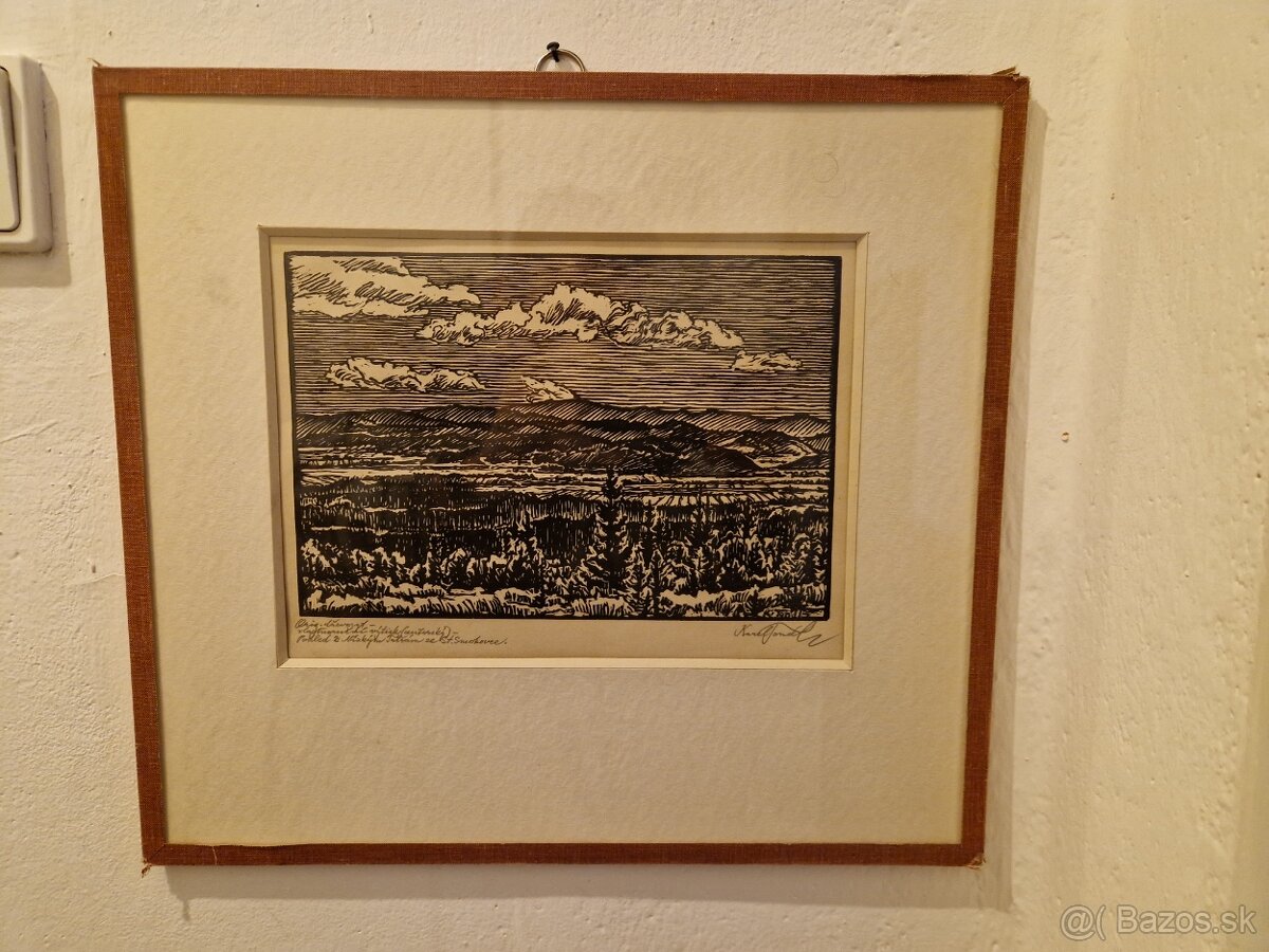 Originál česká moderní grafika , autor Karel TONDL (1893-1980), z roku 1950, z cyklu Vysoké Tatry, list III., název: Pohled k Nízkým Tatrám ze Starého Smokovce.Celkový rozměr 39 x 35, vyřez pasparty 19x25,5. Signovany v pravo dole.