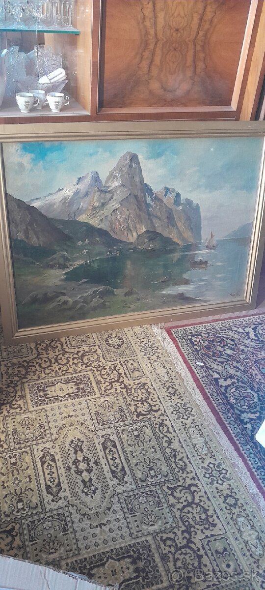 Predám starozitny obraz krajiny,olej na plátne 100 x 70 cm, zmacený viď foto,