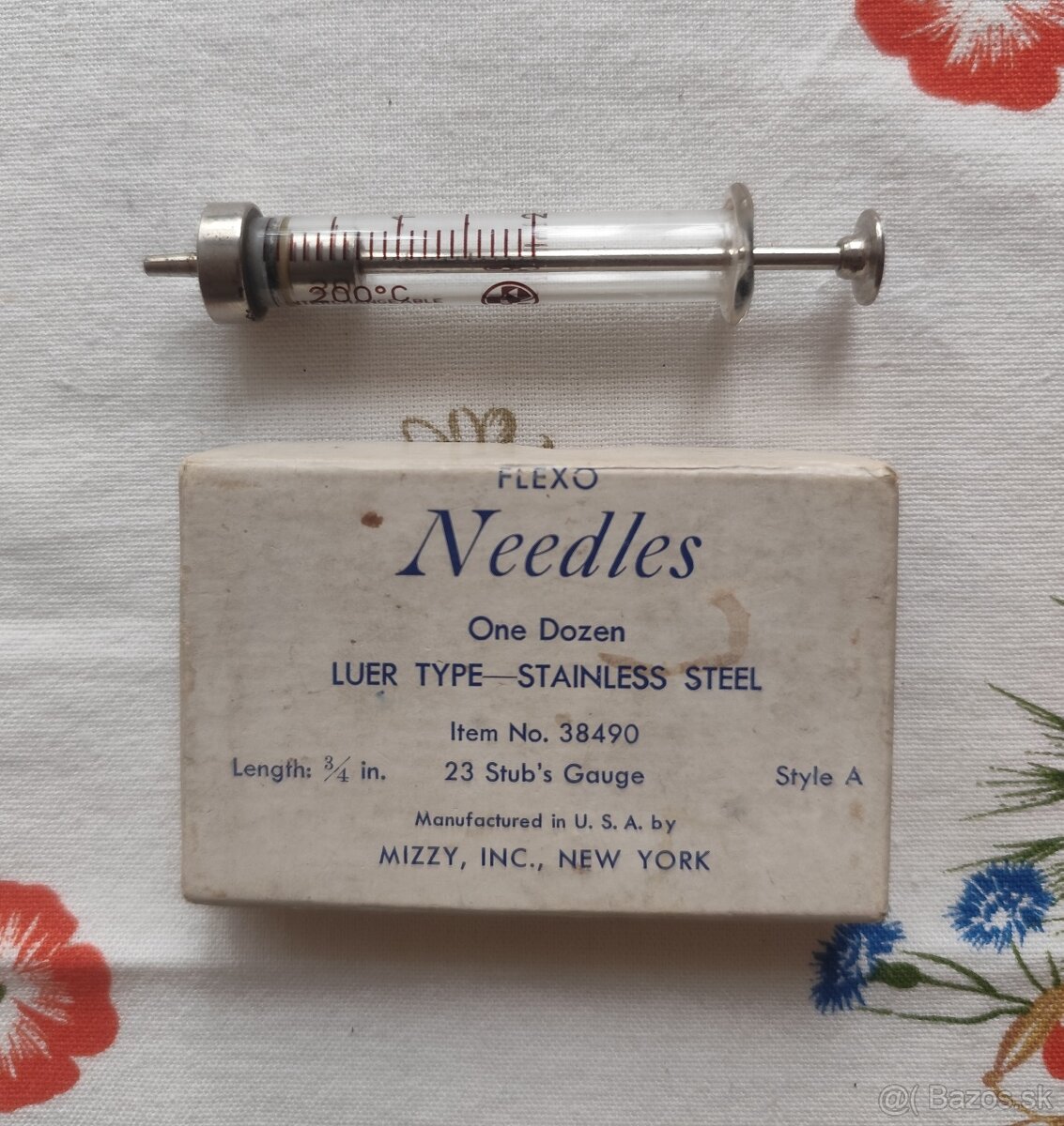 Predám retro kovové ihly na injekčnú striekačku + sklenená injekčná striekačka v originál balení, vyrobené v Amerike v New Yorku. Majú asi 60 rokov. Jeden kus z ihiel chýba.