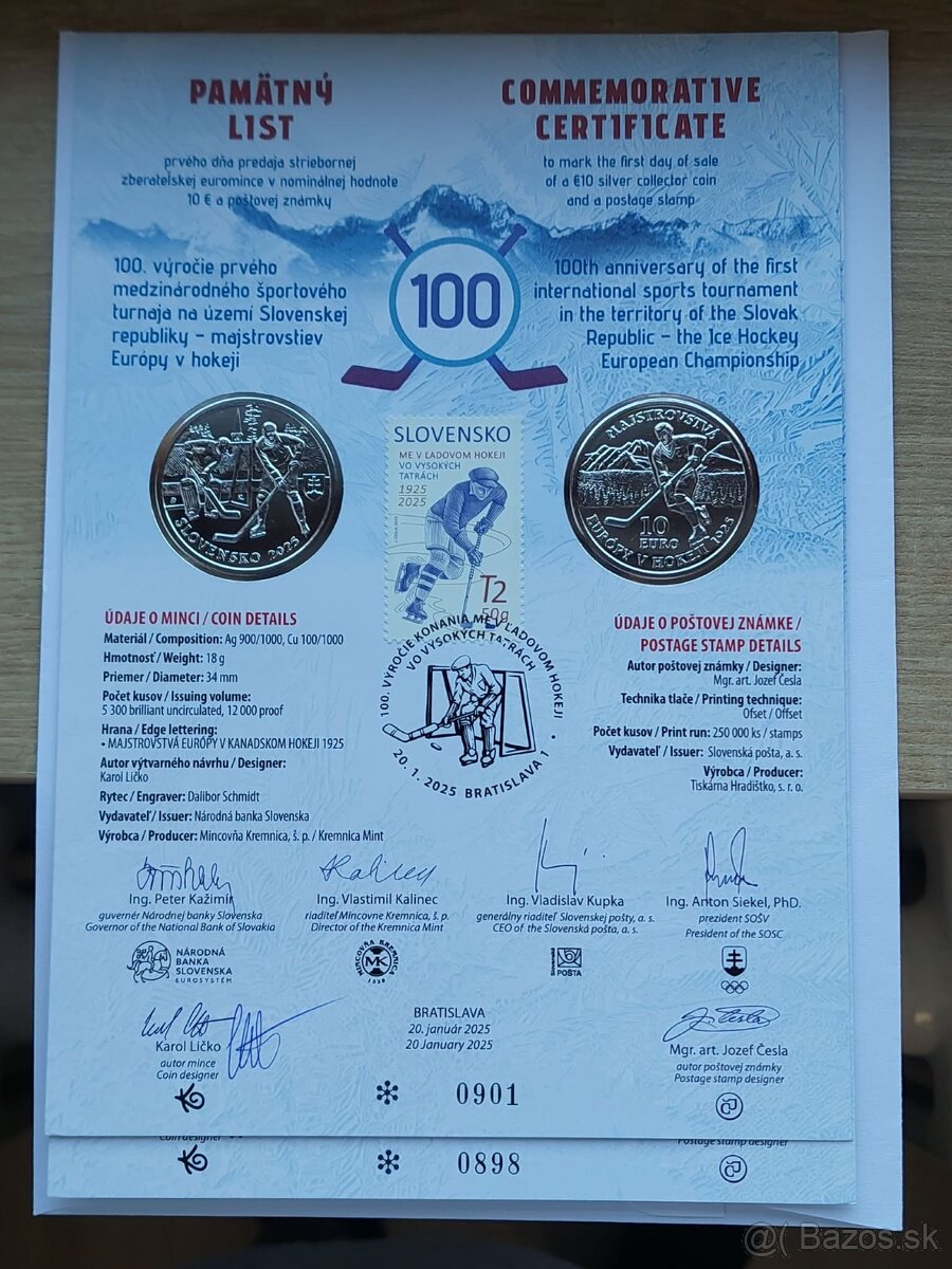 10€/2025 - Prvý medzinárodný športový turnaj na území SR-Majstrovstvá Európy v hokeji - 100. výročie.